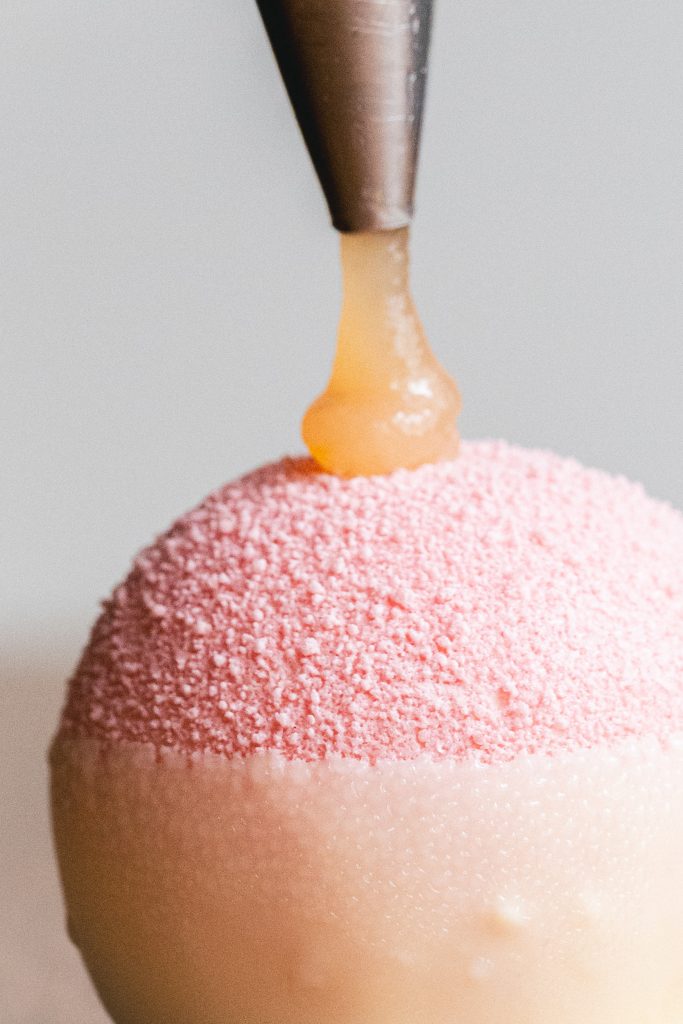 Pêche – Confit pêche, morceaux de pêche, pain de Gênes, crème verveine